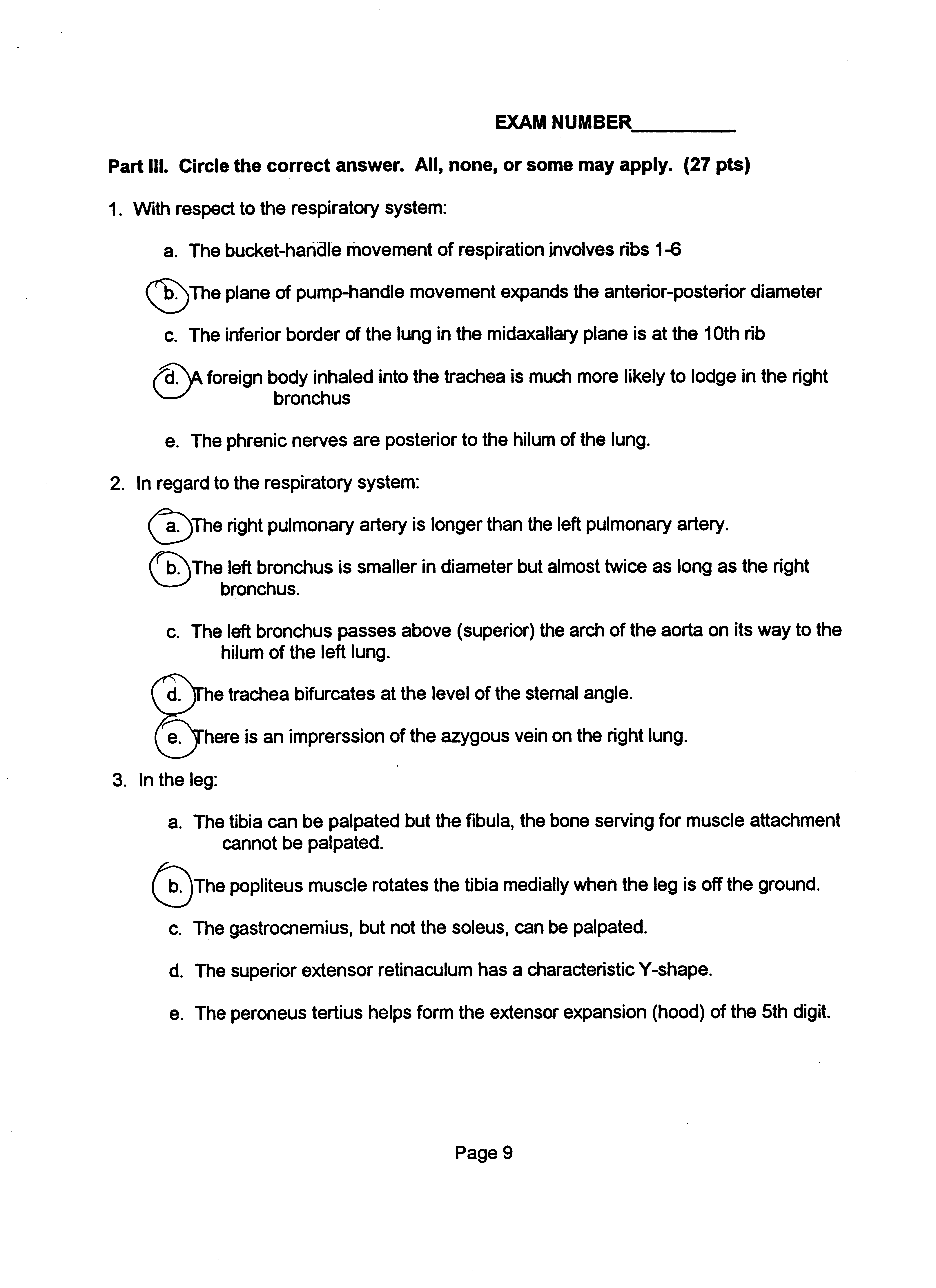 Human Gross Anatomy - Examination Key for Lower Limb and Thorax Short Answer (44 pts)
